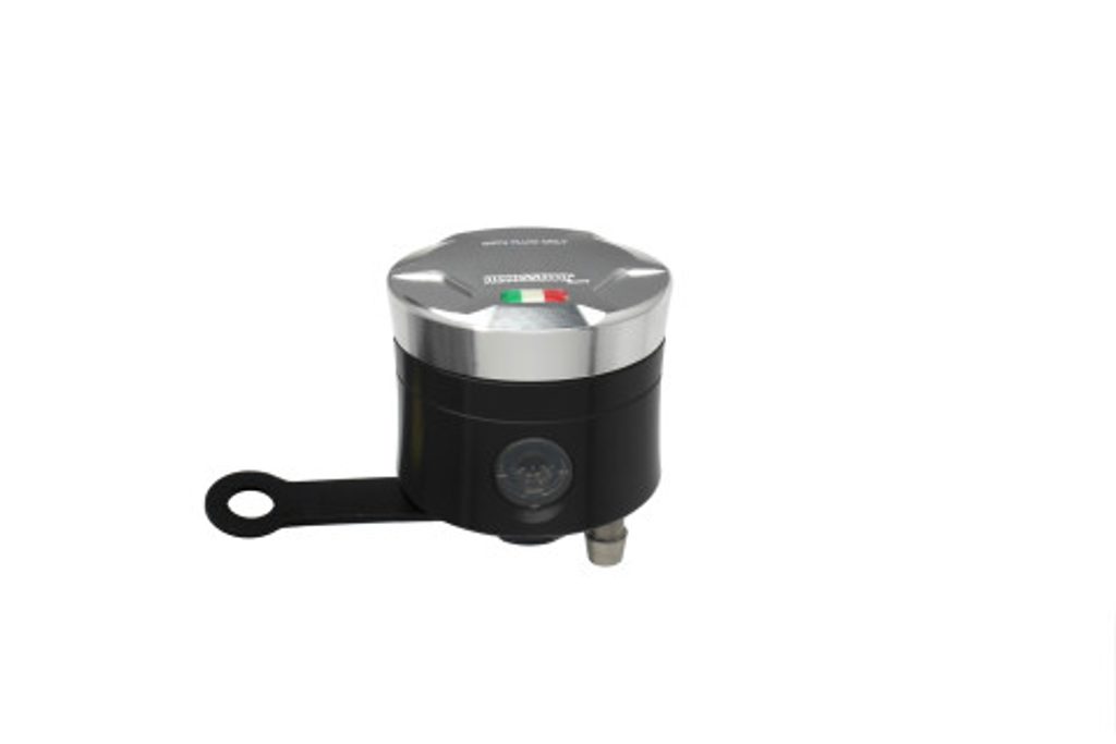 Accossato CNC-worked brake fluid reservoir, capacity of 25 cm3, vertical oil spill. Straight braket provided. You can choose the colour match of the c