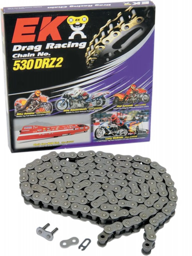 Pro zvládnutí neobvyklých vysokých zatížení v drag racingu jsme vyvinuli speciální tloušťku a rozměry článků, díky čemuž je tento řetěz nejsilnější v řadě 530. Jedná se o speciální řetěz určený přímo pro drag racing, který má vysokou reputaci a osvědčenou spolehlivost v zahraničí.