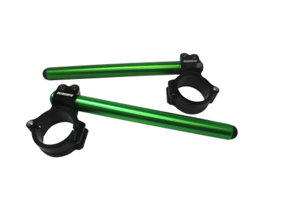 Řídítka ACCOSSATO CNC obráběná, dodávaná s kovovou objímkou složenou ze dvou polokruhů, s úhlem náklonu 10°.