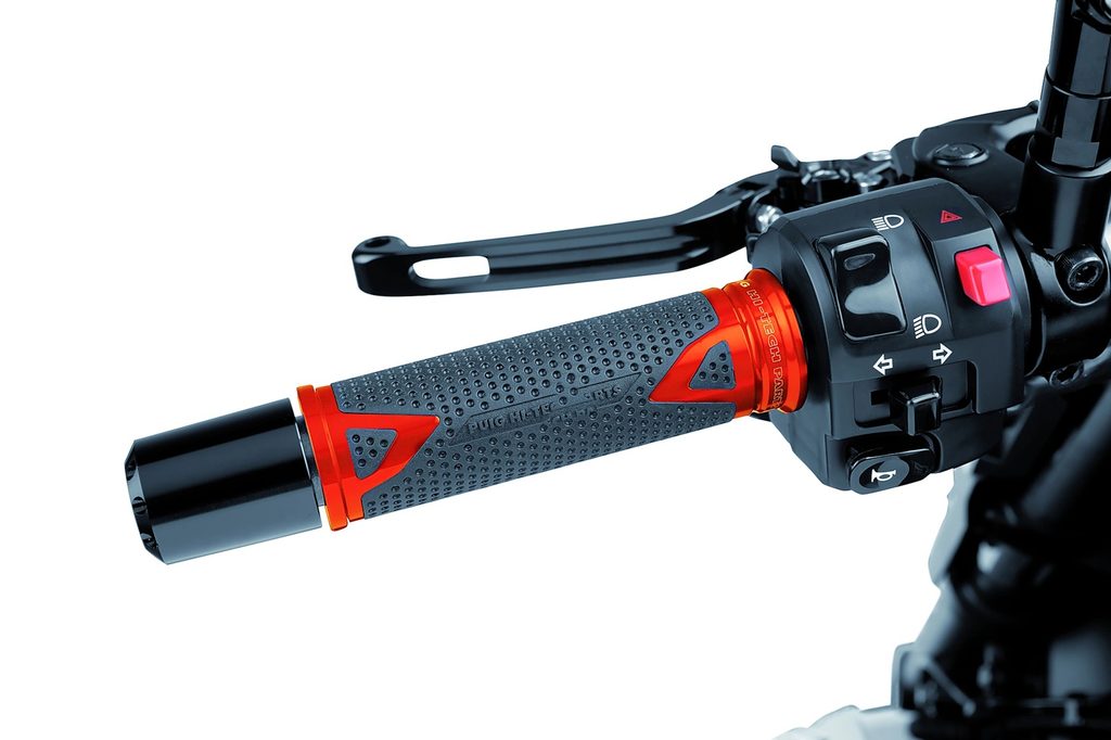 Úchop rukojetí je velmi příjemný a má protiskluzovou texturu, která zajišťuje, že vaše jízda bude bezpečná a plná pohodlí. Vedle pryže mají rukojeti eloxovanou hliníkovou vložku dostupnou v různých barvách, díky které si můžete motocykl přizpůsobit podle svého vkusu a učinit jej jedinečným.