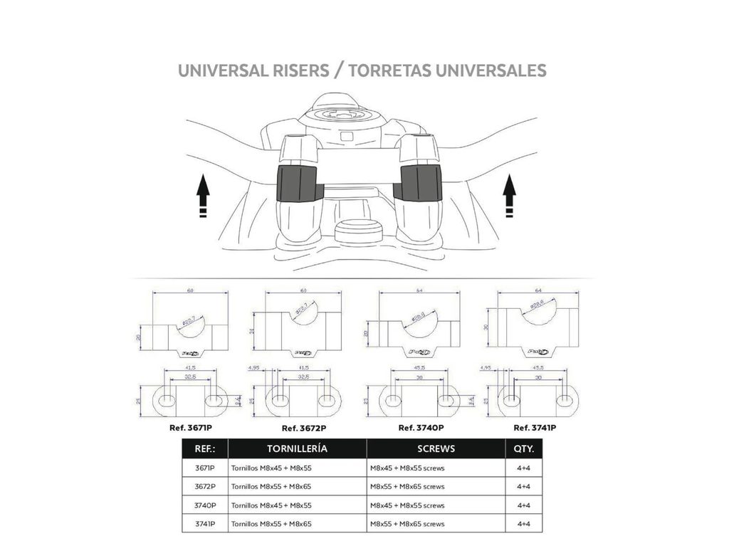 Puig nabízí podložky pro řídítka o průměru 22, 25, 29 a 32 mm, přičemž každá varianta je dostupná ve dvou různých výškách: 20 a 30 mm.