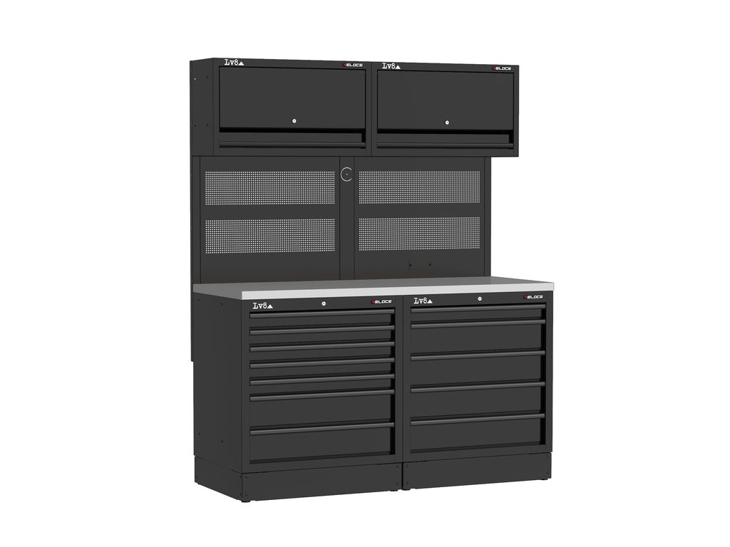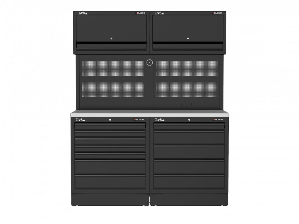 Pracovní stůl délky 1600 mm s 7 zásuvkovou a 5 zásuvkovou skříňkou se zámkem. Masivní dřevěná pracovní deska, dvojitý perforovaný panel na nářadí, dvě nástěnné úložné skříňky a příprava pro elektrickou zásuvku. K dispozici také v provedení s nerezovou nebo melaminovou deskou.