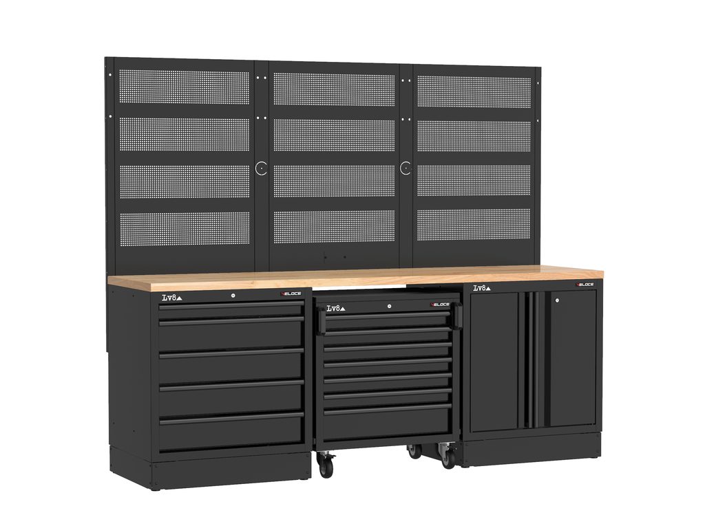 Pracovní stůl délky 2400 mm s 5 zásuvkovou skříňkou, 7 zásuvkovým pojízdným vozíkem a dvoudveřovou skříní s nastavitelnou policí a zámkem. Masivní dřevěná pracovní deska, perforované panely na nářadí a příprava pro elektrickou zásuvku. K dispozici také ve variantě s nerezovou nebo melaminovou deskou.