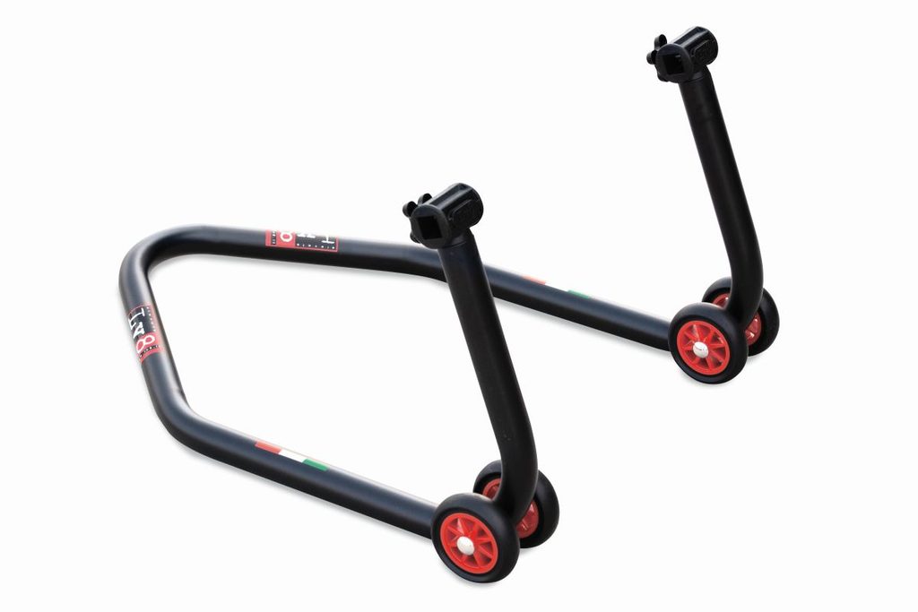 Výškově nastavitelný zadní stojan bez unašečů. Kompatibilní se všemi motocykly na trhu s oboustrannou kyvnou vidlicí.