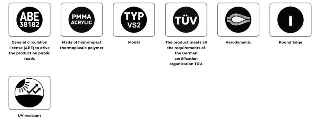 Tato plexi jsou vyráběna s využitím nejmodernějších technologií z akrylátu o tloušťce 4 mm, s UV ochranou a zaobleným okrajem o tloušťce 2 mm. Toto provedení dodává plexi elegantní vzhled a zároveň zvyšuje bezpečnost, přičemž splňuje normy německého TÜV.