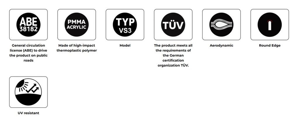 Montáž štítu nevyžaduje žádné další díly, jako jsou lišty, a každý štít je dodáván s podrobnou aerodynamickou studií, která uvádí zlepšení výkonu a ochranu jezdce.