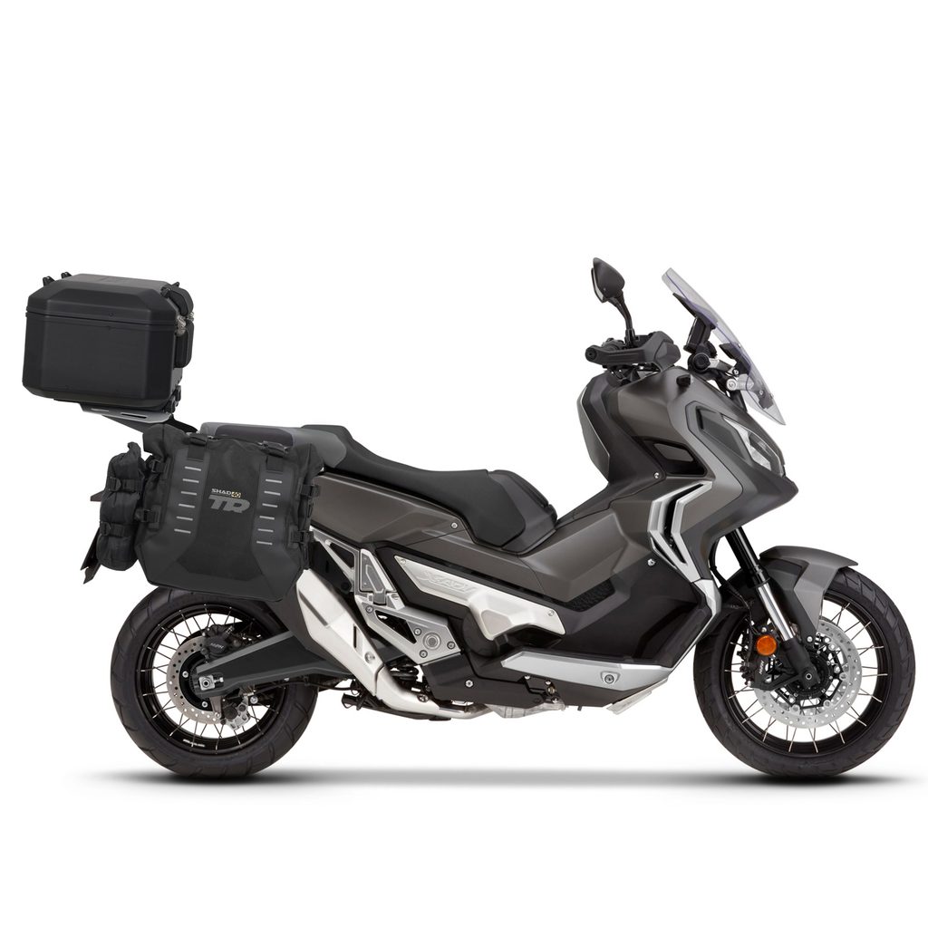 Sada ADVENTURE TERRA SHAD obsahuje sadu sedlových brašen TR40 určených pro jízdu v terénu a montážní sadu 4P SYSTÉM pro upevnění, také vrchní hliníkový kufr TR55 PURE BLACK včetně montážní sady TOP MASTER a plotny.