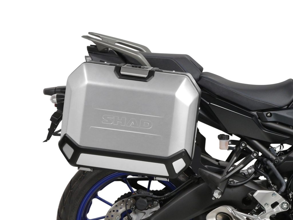 Kompletní sada bočních černých hliníkových kufrů SHAD TERRA BLACK 47L/47L, včetně montážní sady SHAD YAMAHA MT-09 Tracer / Tracer 900