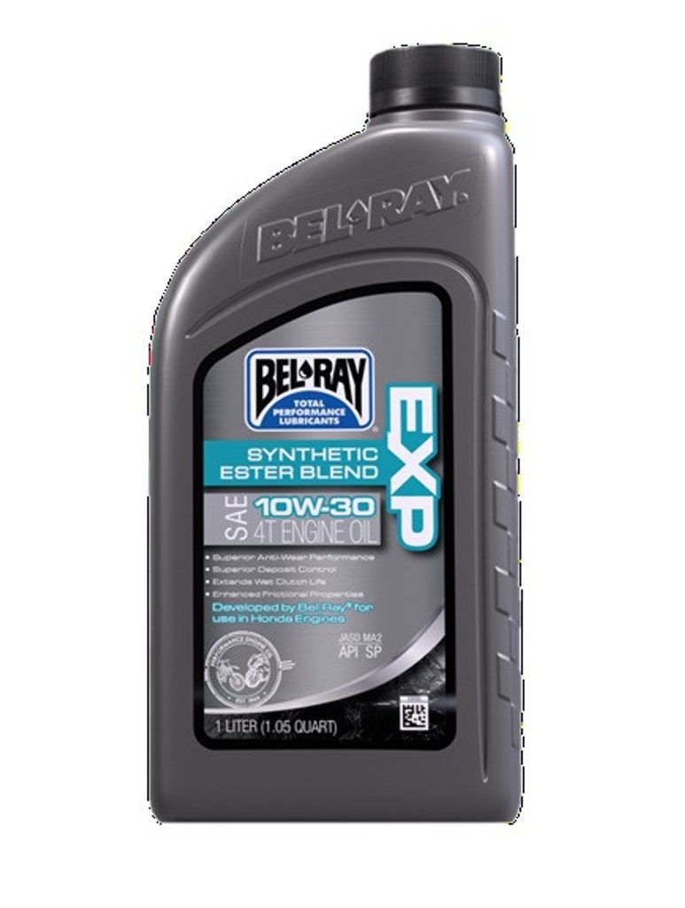 Bel-Ray EXP Synthetic Ester Blend 4T Engine Oil je motorový olej pro čtyřtaktní motocykly, který kombinuje syntetické oleje nejvyšší kvality s vybranými minerálními základovými oleji, aby zajistil nejvyšší úroveň ochrany pro všechny čtyřtaktní motocykly. Obsahuje střižně stabilní zlepšovače viskozitního indexu, které zabraňují poklesu viskozity. Splňuje výkonnostní požadavky API SN a JASO MA2. Je vhodný pro vzduchem i kapalinou chlazené čtyřtaktní motory a pro mokré spojky.